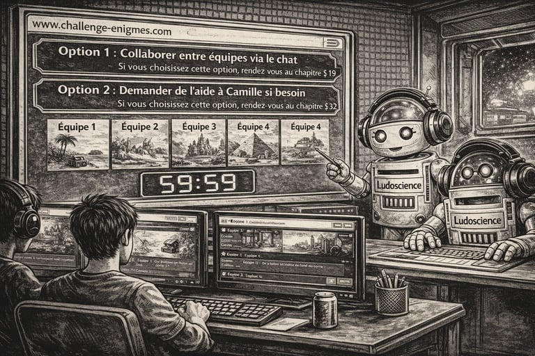 Ludia constate que le temps s’égraine rapidement. Des équipes concurrentes commencent à échanger sur le chat pour trouver des idées, mais cela tourne en rond. Au final, seule l’équipe aidée finit par gagner. Ludia décide de :
