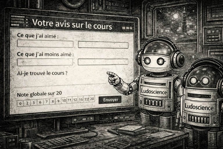 Les élèves sont invités à se connecter sur un formulaire en ligne où ils doivent répondre à une série de questions en mode individuel. Il s’agit d’évaluer ce que l’on a aimé ou moins aimé dans le cours. Il est aussi demandé si le cours a semblé facile ou plutôt difficile. Enfin une notation globale sur 20 est demandée. Ludia précise :