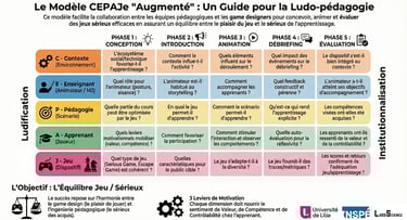 CEPAJe (Contexte, Enseignant, Pédagogie, Apprenant, Jeu) est un modèle visant à permettre à la fois de concevoir et d'évaluer une séance ludopédagogique.
